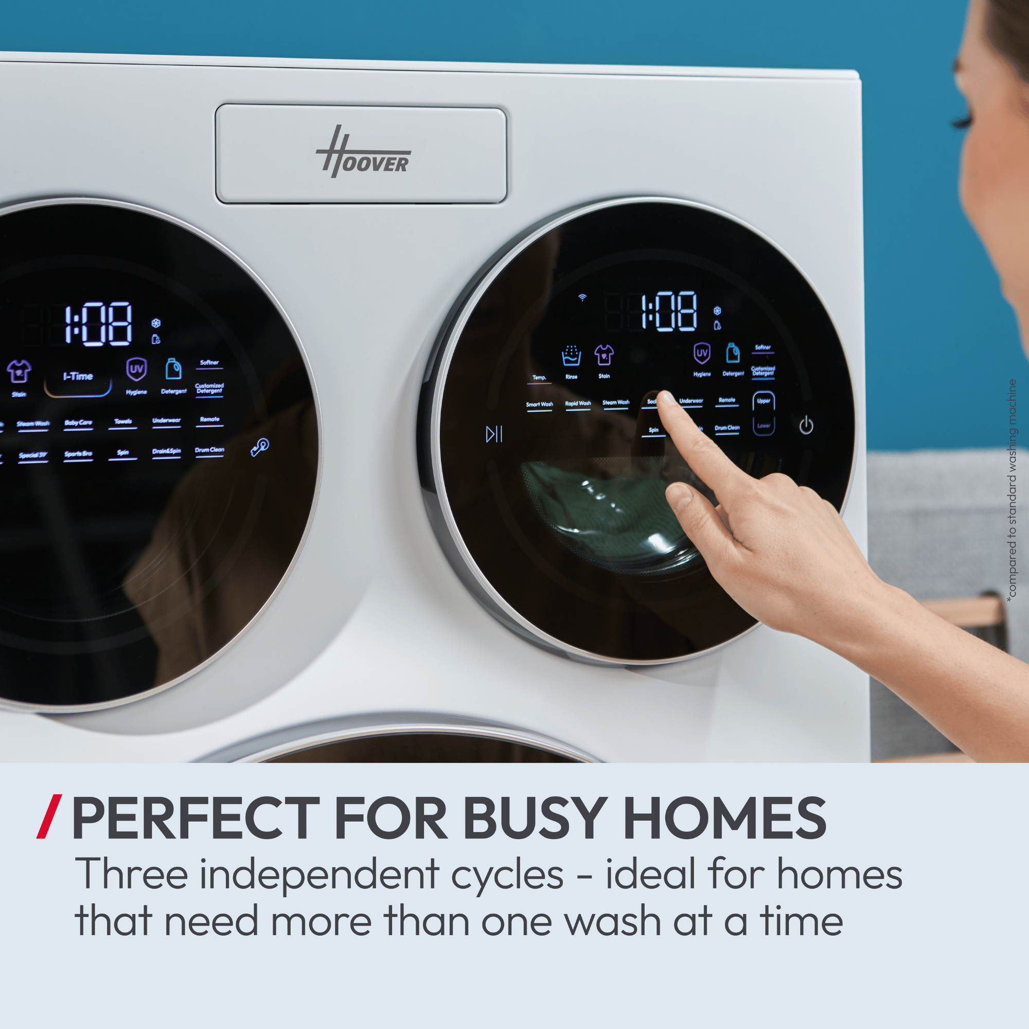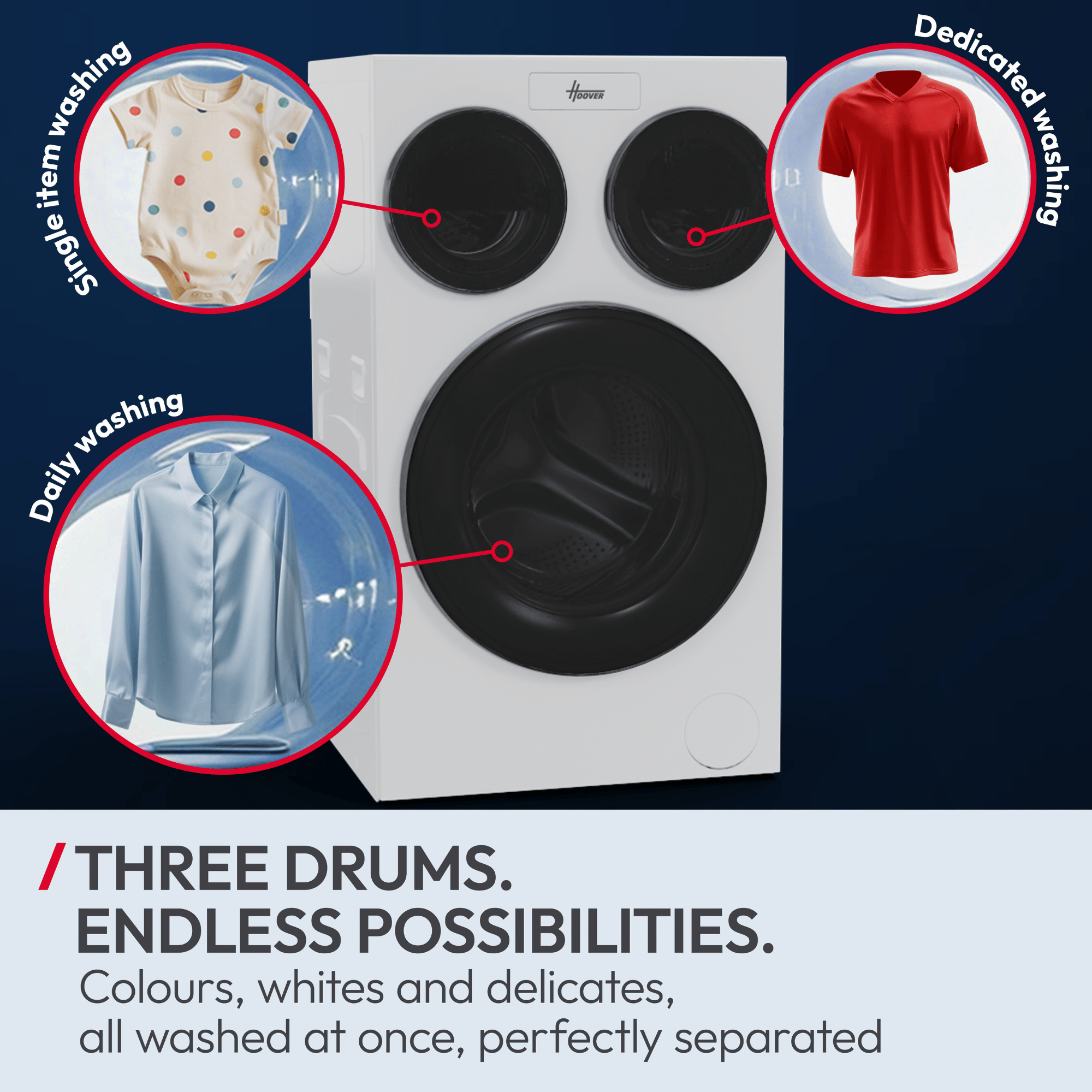 - Three drums, endless possibilities: Tailored cycles for delicates, sportswear, baby clothes, and quick washes.