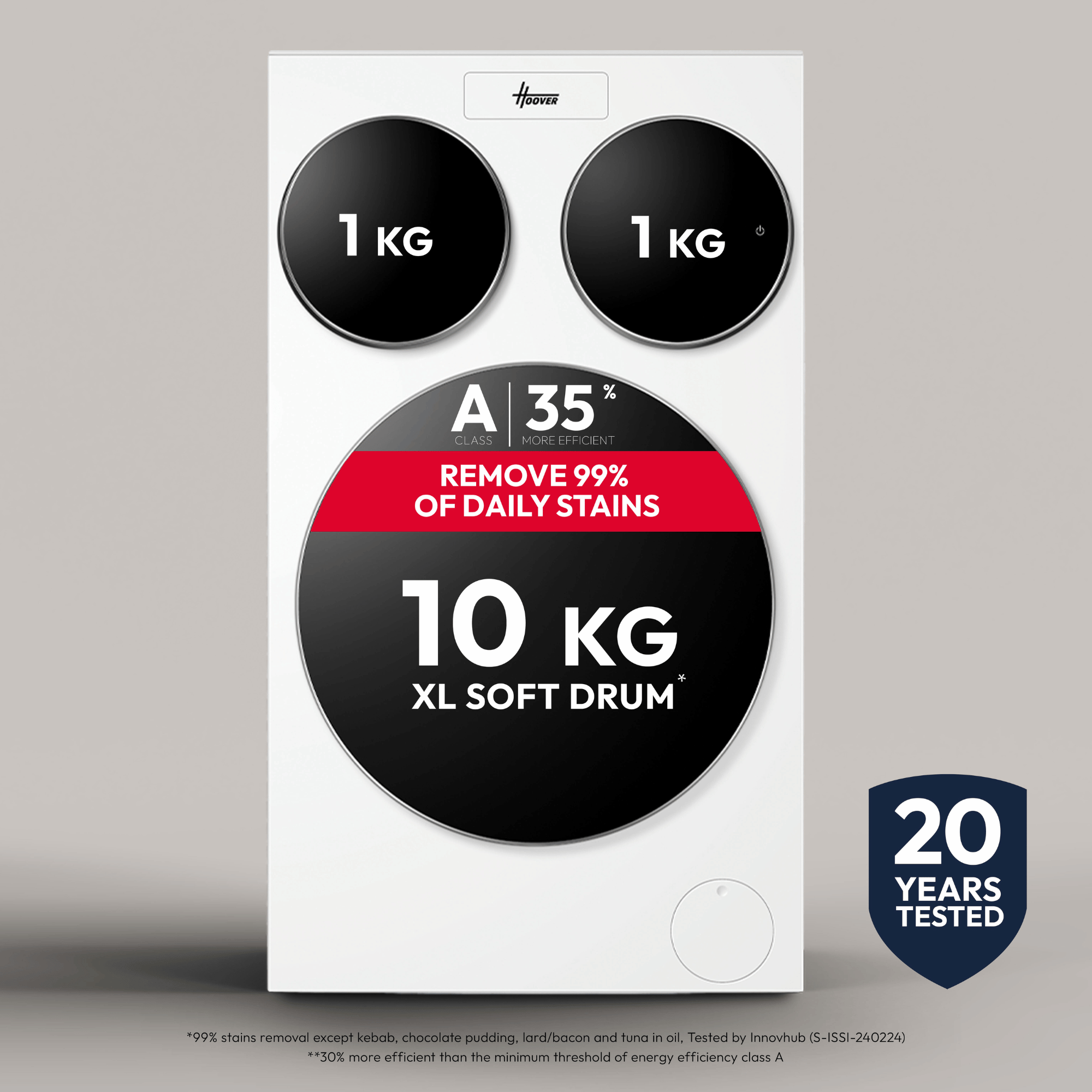 Wash it all at once, in your way. With Hoover MultiWash Washing Machine - White - 10 kg + 1 kg + 1 kg you have care, hygiene, and energy-efficient performance for spotless results.