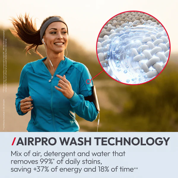 - Faster stain removal: AirPro Wash saves energy and cares for fabrics better.