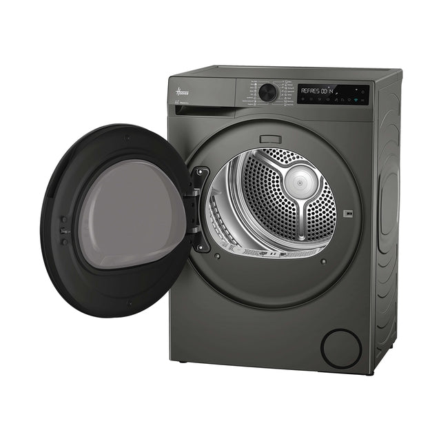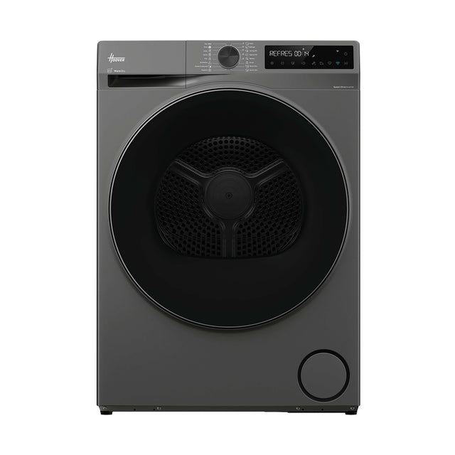 The Hoover Pro Dry Series 5 (Heat Pump) Tumble Dryer - Graphite - 9KG combines energy-efficient drying with a 99.9% antibacterial Hygiene Cycle, gentle Warm Dry Pro for delicates, and AI Smart Move to prevent tangles. Effortless control is available via the hOn app.
