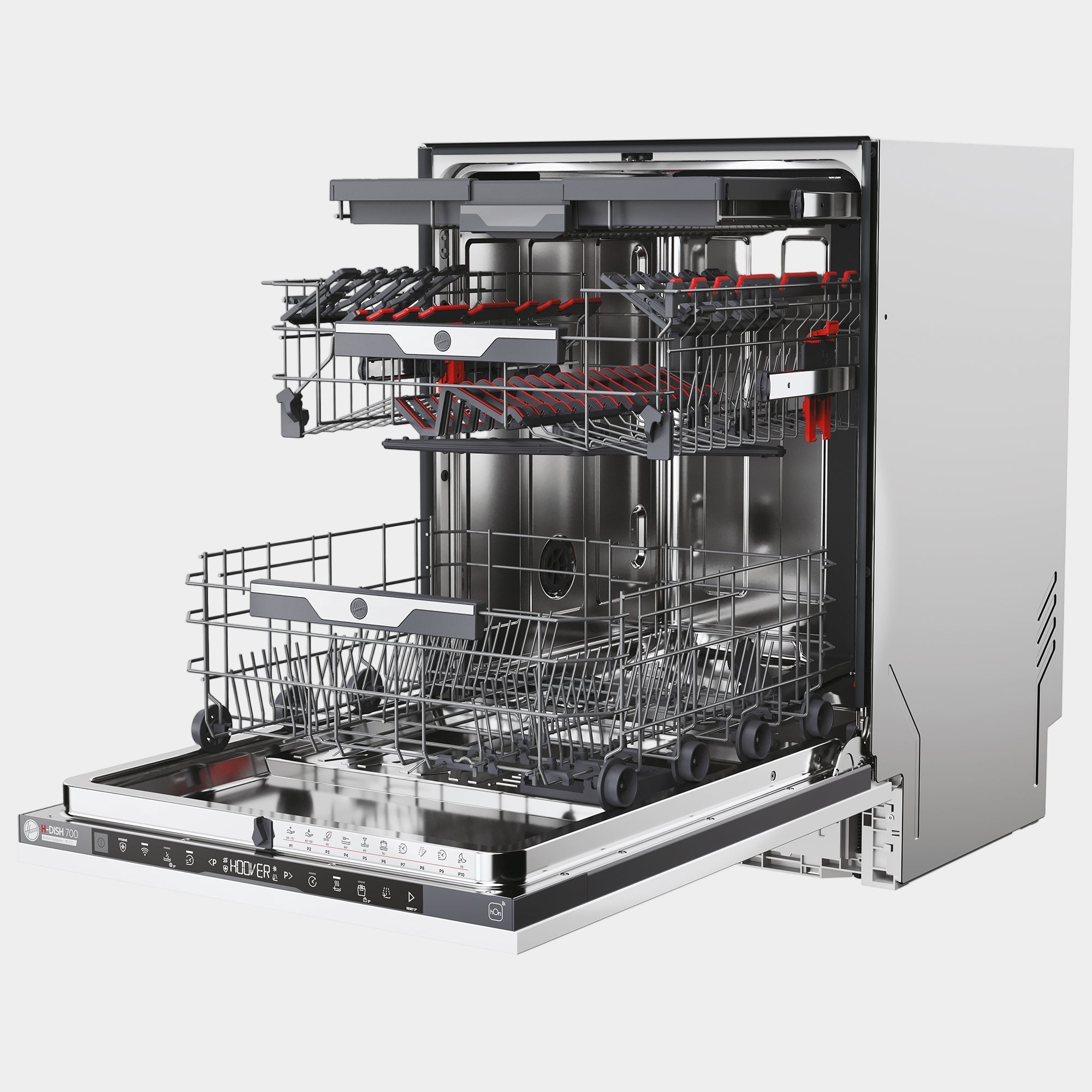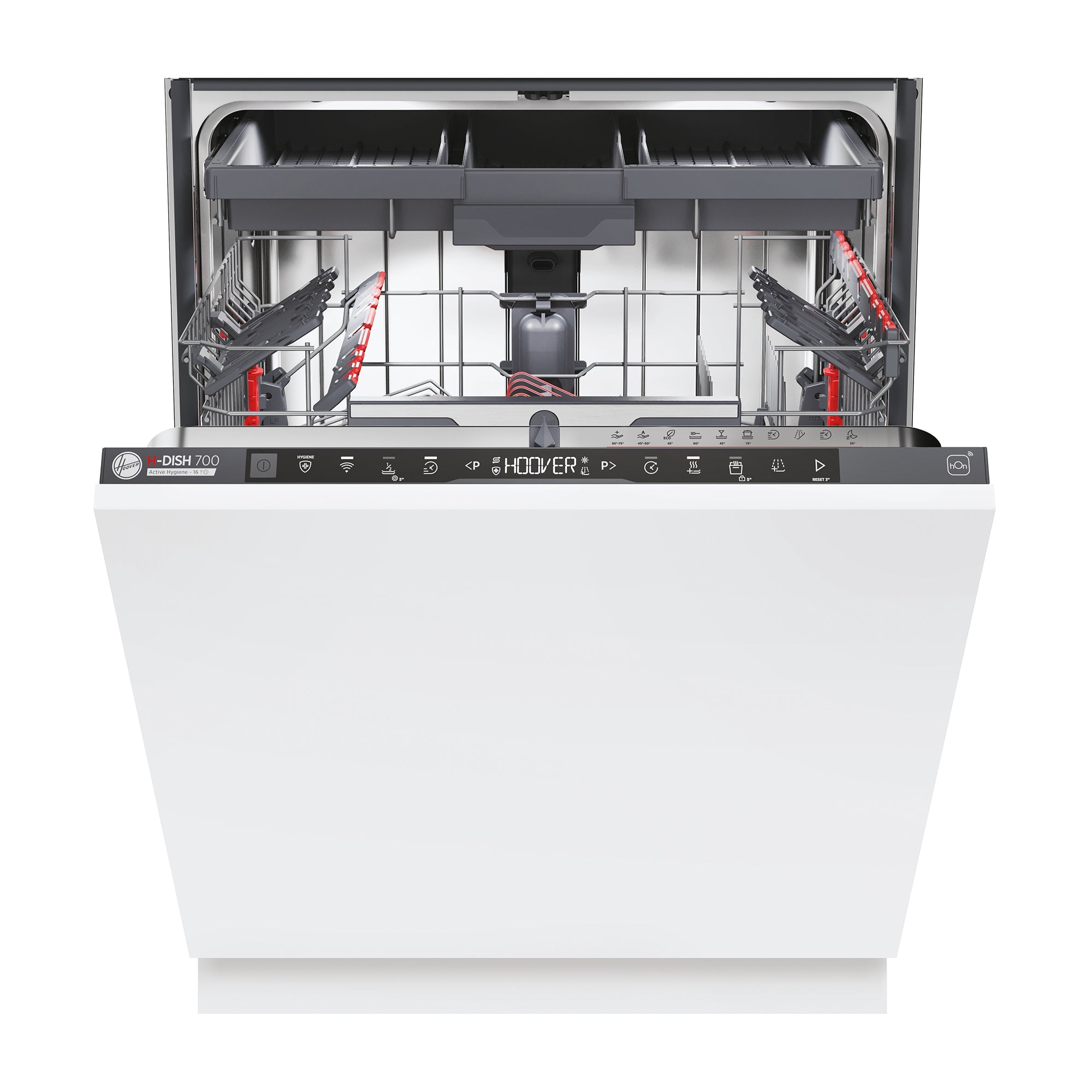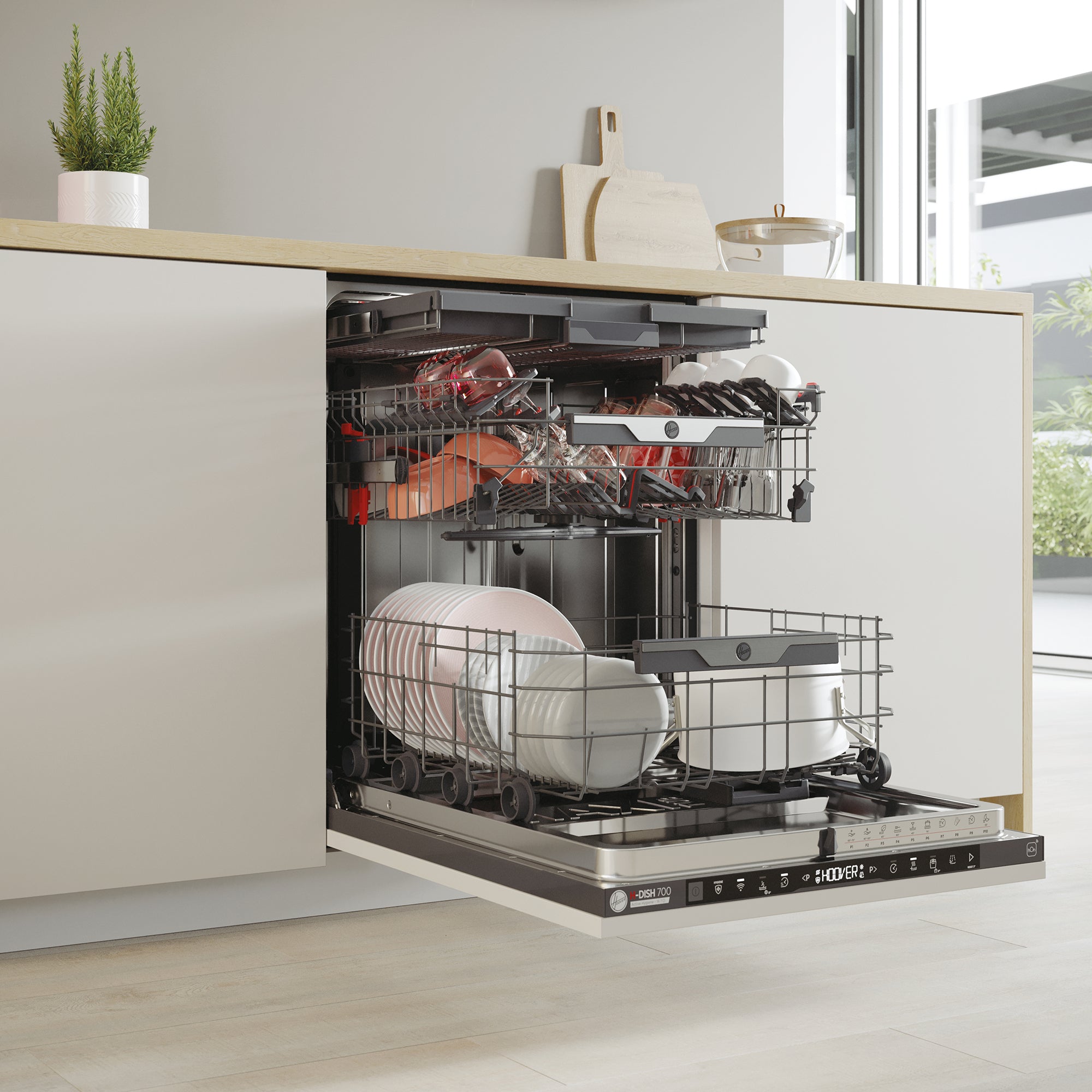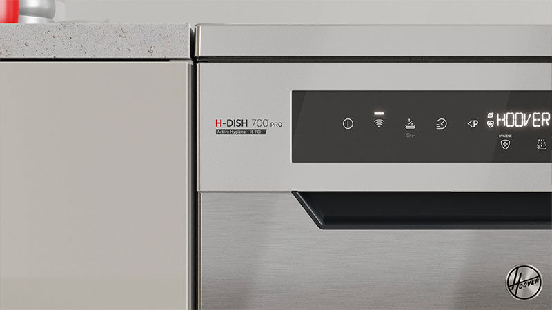 The Hoover H-Dish 700 - Anthracite - 16 Place Settings washes, sanitizes, and dries all kitchenware, using Active Hygiene Protection to remove up to 99.9% of viruses and bacteria.