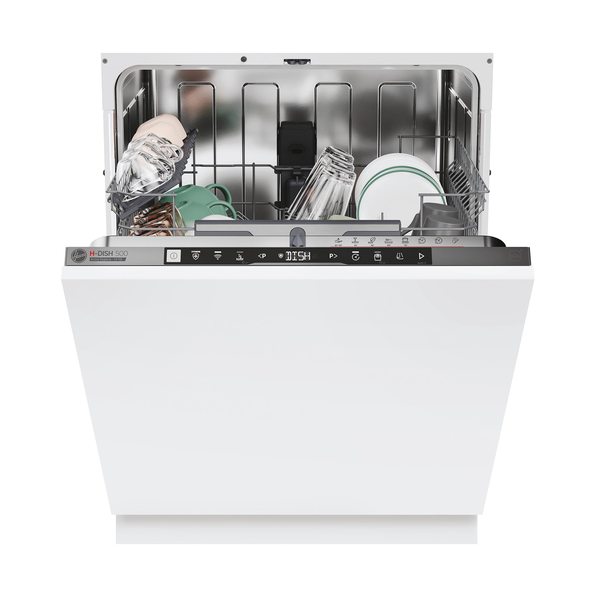 The H-Dish 500 - Silver - 14 Place Settings washes, sanitizes, and dries all kitchenware, with Active Hygiene Protection eliminating up to 99.9% of viruses and bacteria.