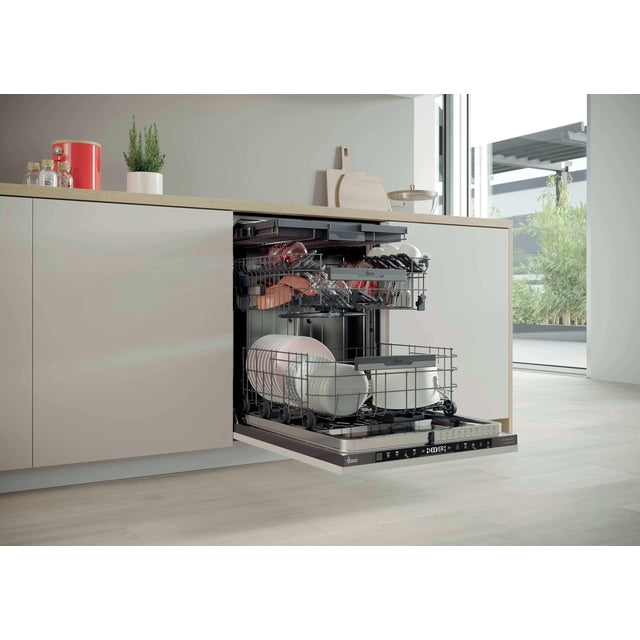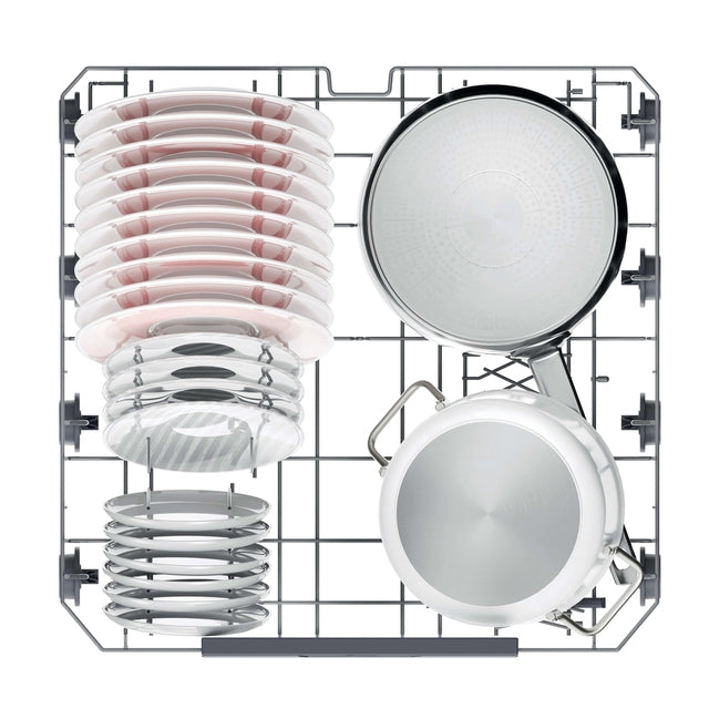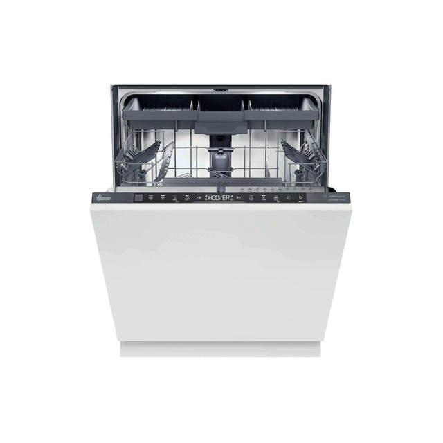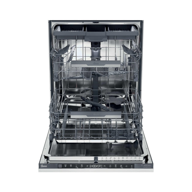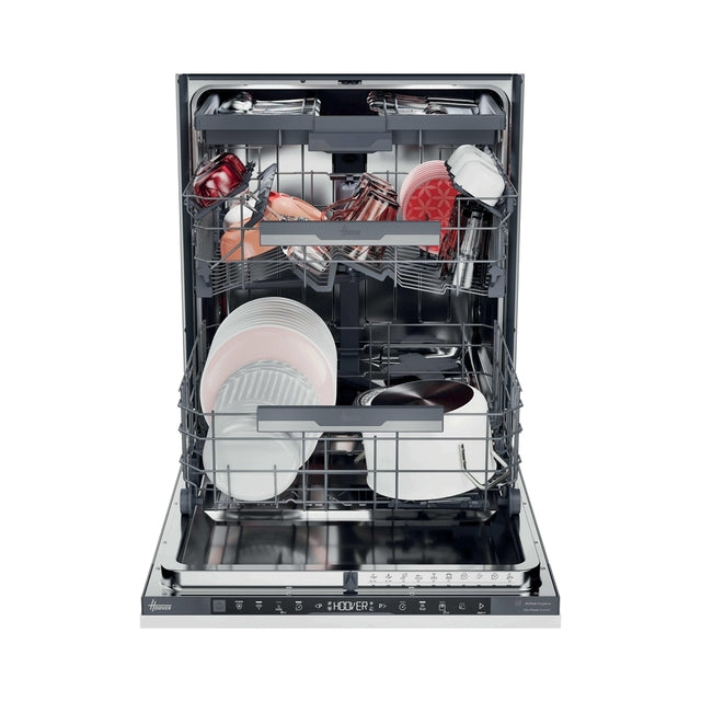 The new Hoover H-Dish 700 Integrated Dishwasher - White - 14 Place Settings perfectly washes, sanitizes, and dries all kitchenware, even delicate items, using the Active Hygiene Protection system to remove up to 99.9% of viruses and bacteria.