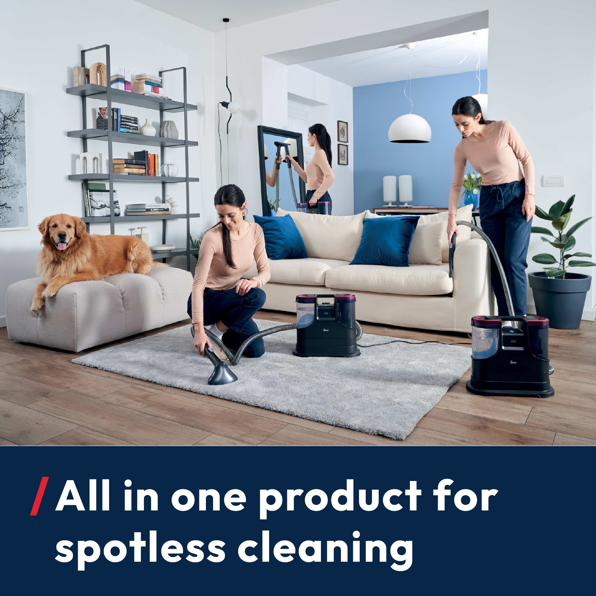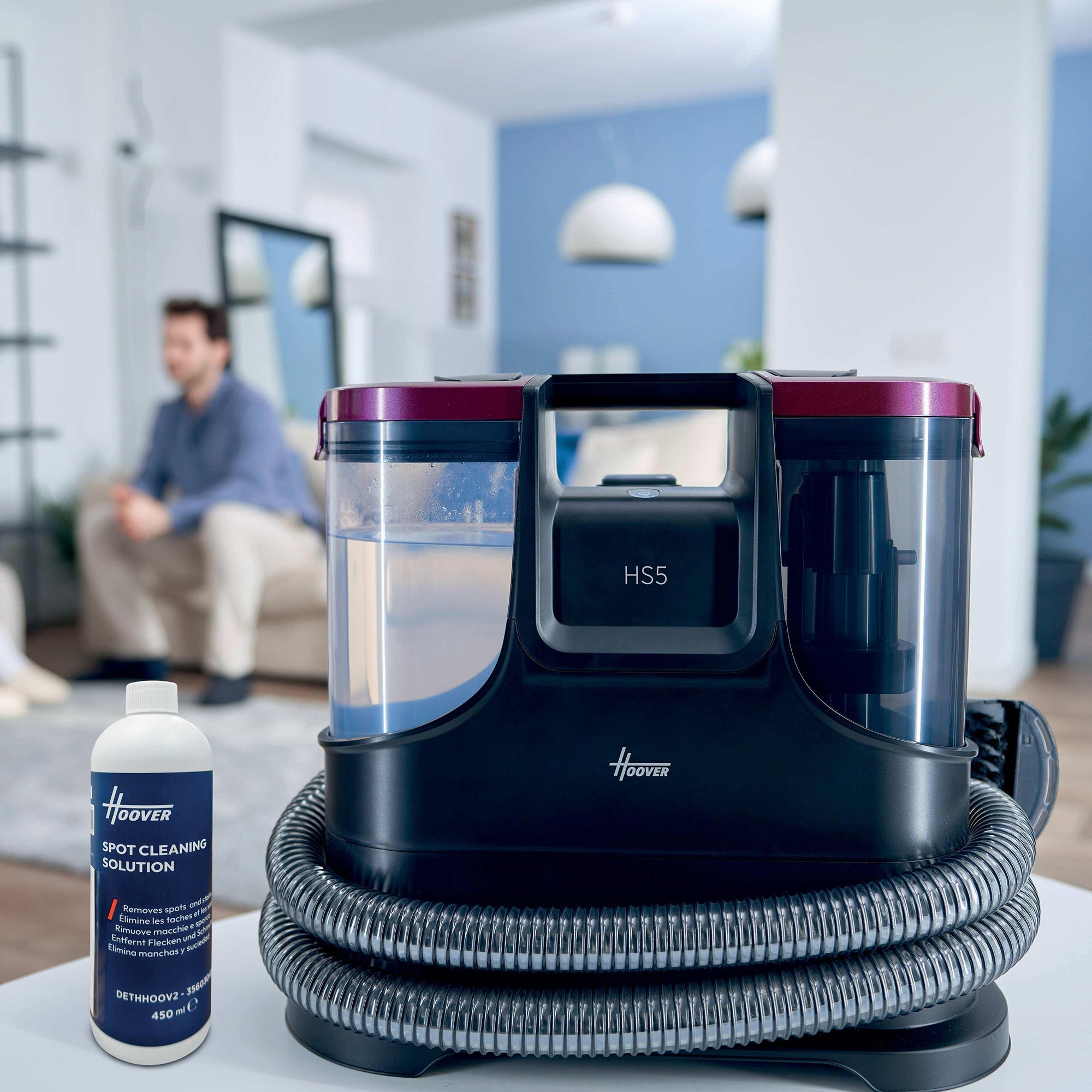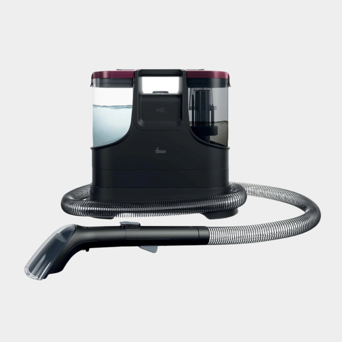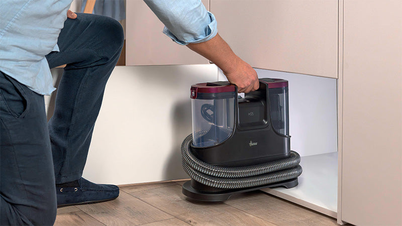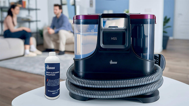 The Hoover HS5 Spot Wash & Dry removes stains fast with heated water (40°C in 30 seconds) and powerful 400W suction. It sprays, washes, brushes, and vacuums all at once—ideal for carpets, upholstery, cars, and glass. Compact and easy to store, it includes multiple tools for versatile cleaning.
