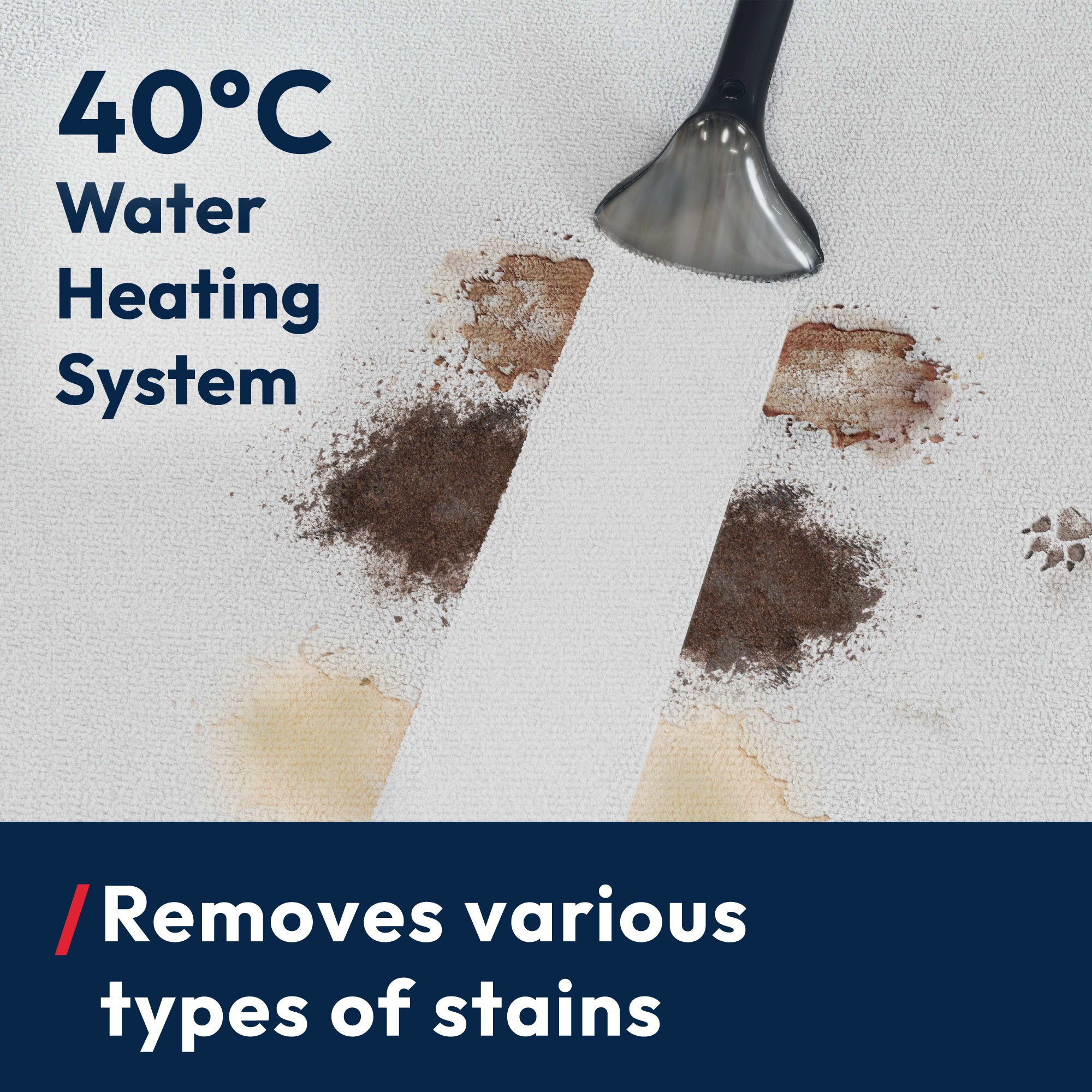 - Heated Stain Removal: Water heats to 40°C in 30 seconds for tough stains.