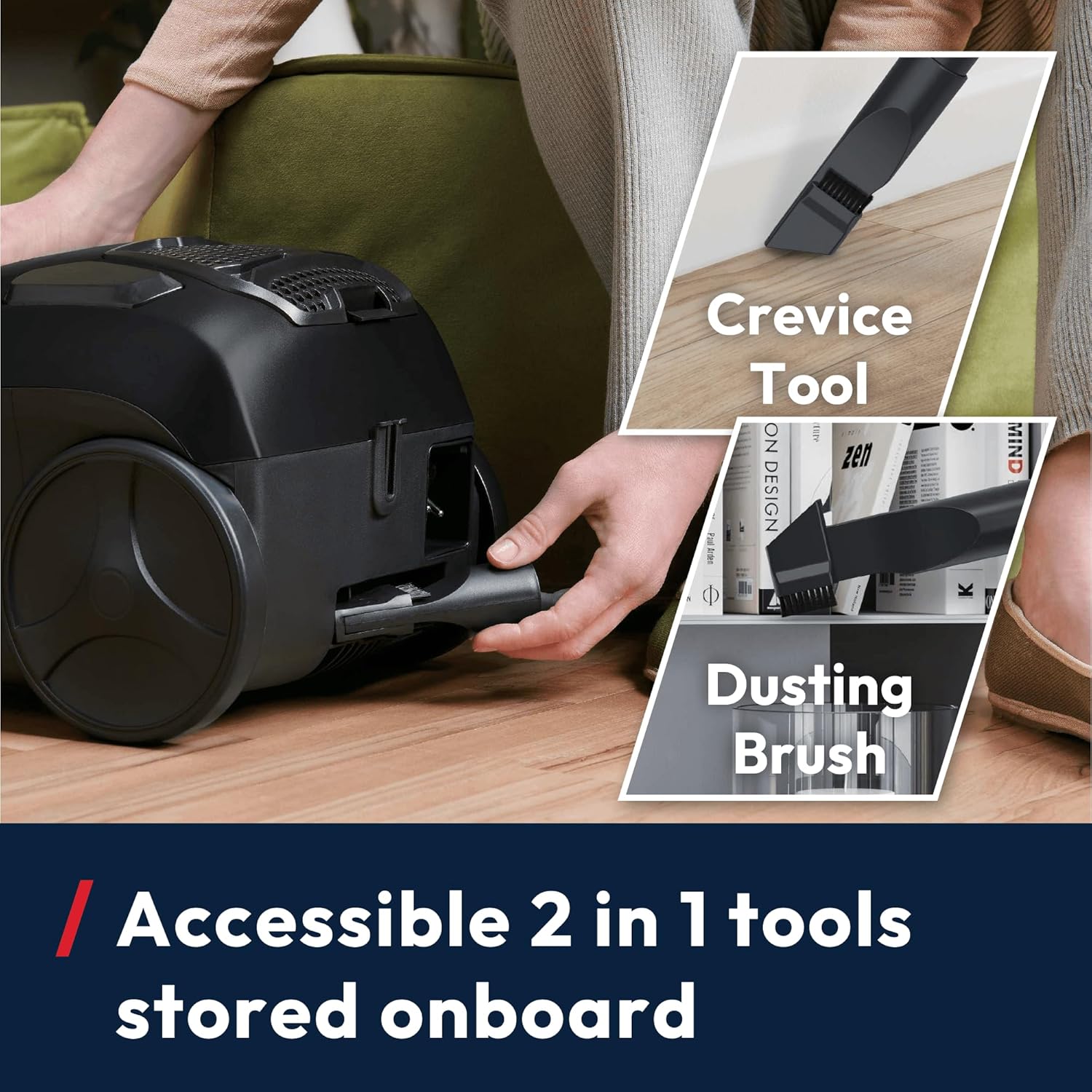 - 2-in-1 accessory - handy dusting brush and crevice tool onboard