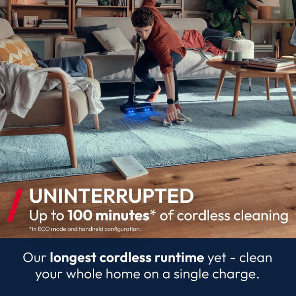 - Long Runtime: Clean up to 100 mins* in handheld mode with a removable, rechargeable battery.