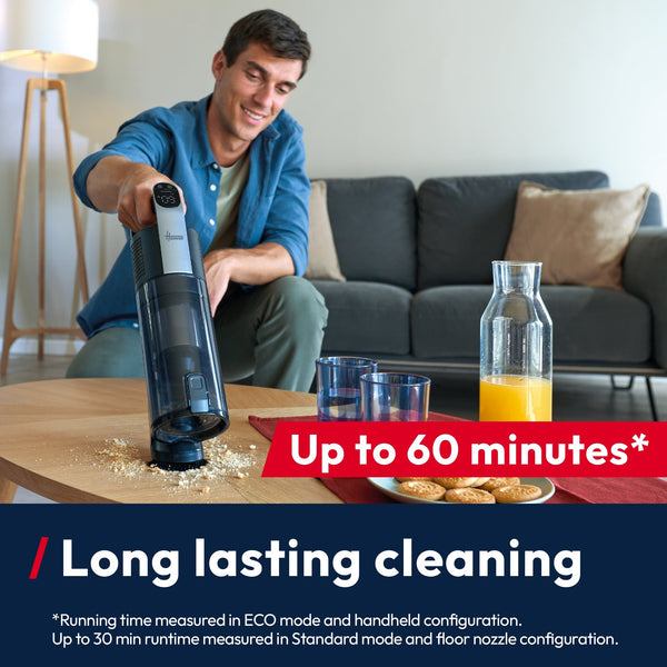 Enjoy plenty of cleaning time — 60 minutes in Eco mode, 30 minutes in Standard mode, or 10 minutes on Turbo.