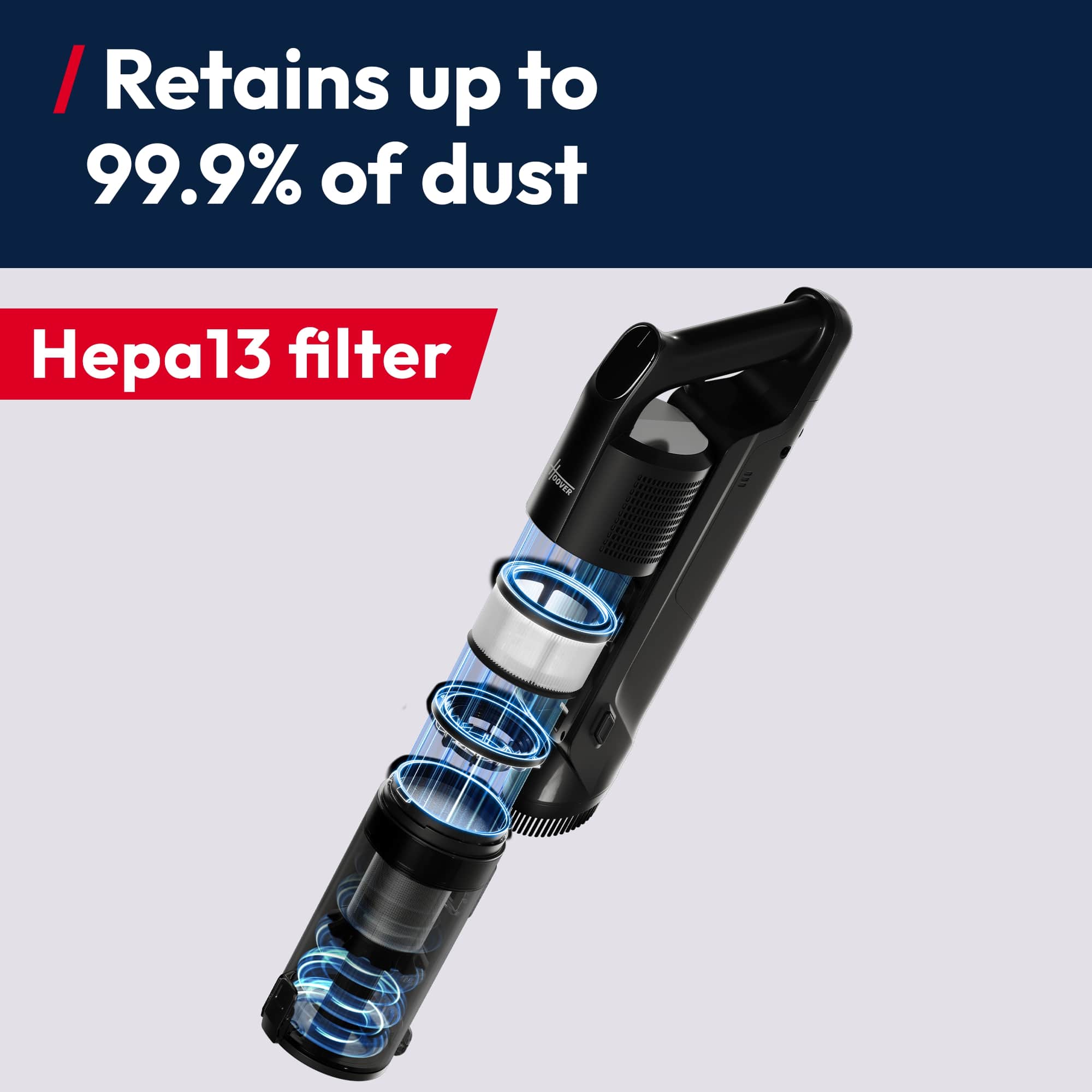 The H13 HEPA filter locks in up to 99.9% of dust particles, ensuring only clean, high-quality air is released back into your home.