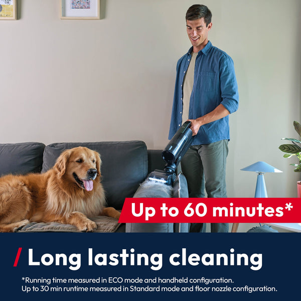 Plenty of time to clean your home with 60 mins in Eco mode, 30 mins in Standard mode, or 10 minutes of max power in Turbo.