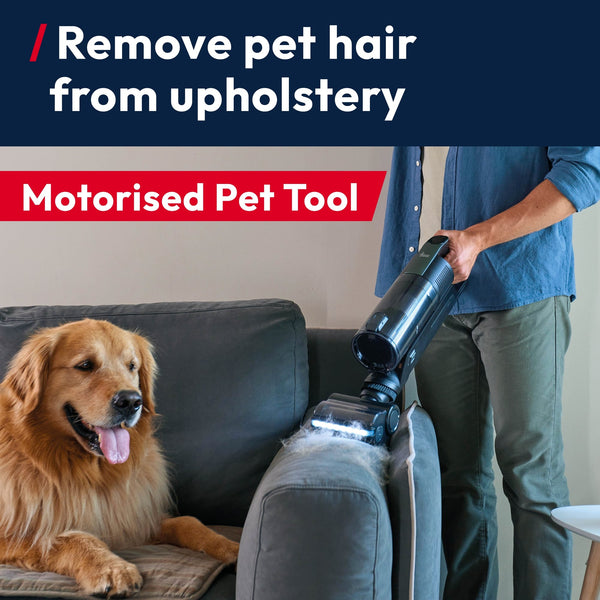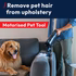 The motorised pet tool effectively removes dog and cat fur from sofas, cushions, and other fabric surfaces.