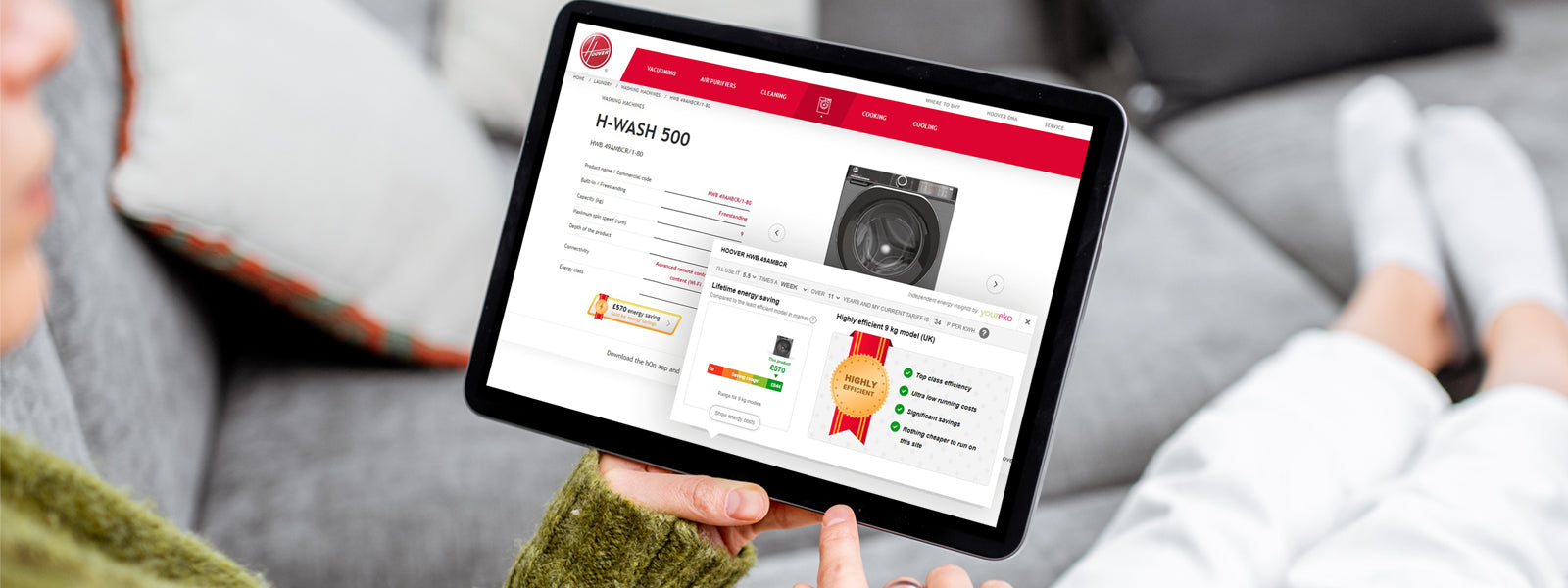 *Washing energy saving based on 4 years, comparing an A rated Hoover washing machine vs the corresponding KG load size on a D or E energy rated Hoover washing machine. Cost of energy based on 34p per kw/h, 284 uses per year.